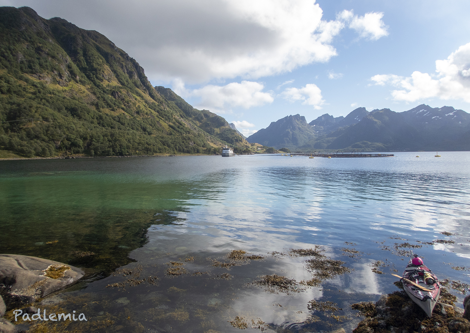 Jeg gikk i land ved Hamneset for å spise, anslo at nå var jeg sikkert begynt å komme halvveis. Du ser faktisk helt riktig, det ligger et oppdrettsanlegg midt i utsikten. Det har seg nemlig sånn at dette ikke bråker! Omsider har disse oppdrettsfolkene tatt til vett, og sørget for stillegående anlegg. Så her går det fint an å sitte i fred og spise maten sin selv om det er et anlegg like ved. Hurra! (Litt ironi der, sånn burde det jo ha vært for lenge siden.)